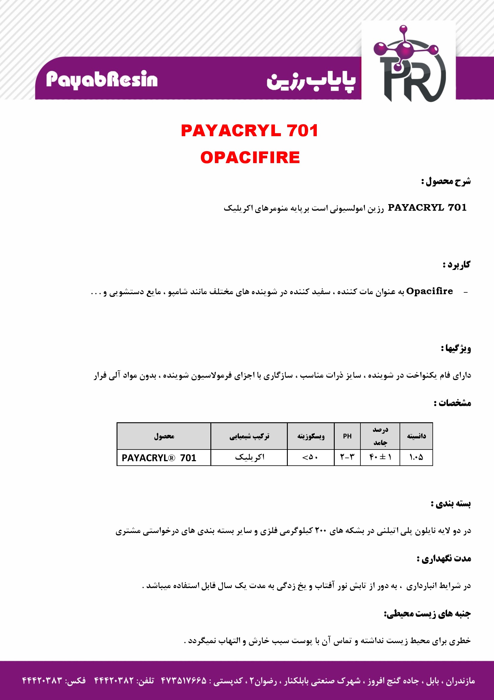 PAYACRYL 701 رزین امولسیونی است برپایه مونومرهای اکریلیک