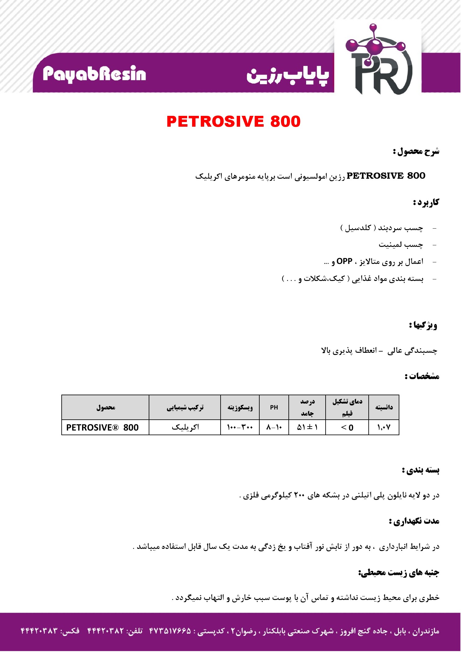 | 1.07 | چسبندگی بالا | <0 | 51 | 8-10 | 100-300 | اکریلیک | PETROSIVE® 800 |