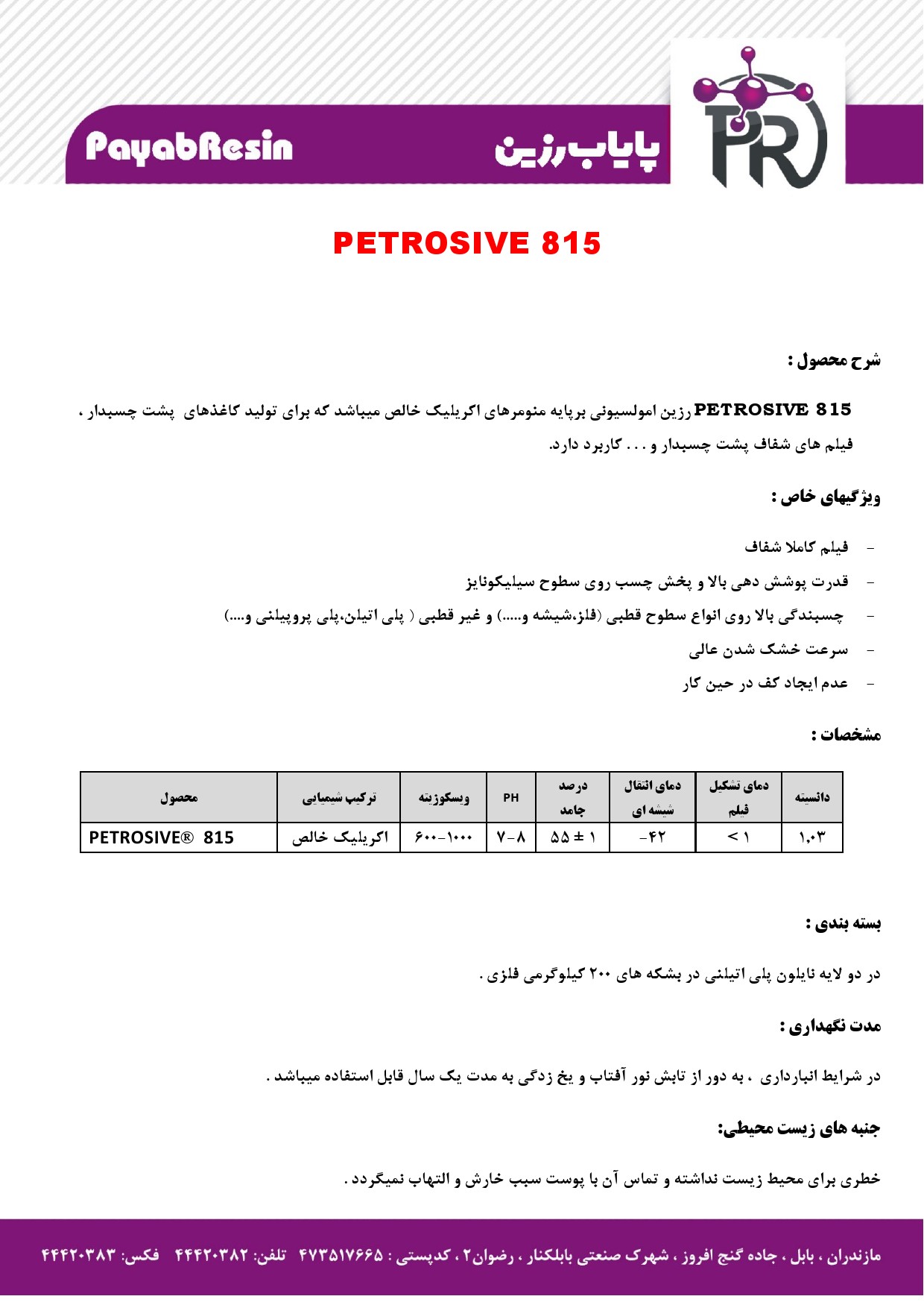 | 1.03 | چسبندگی بالای فیلم خشک روی سطوح پلی اتیلن ، فیلم شفاف | 1 > | 42- | 55 | 7-8 | 600-1000 | اکریلیک خالص | PETROSIVE® 815 |