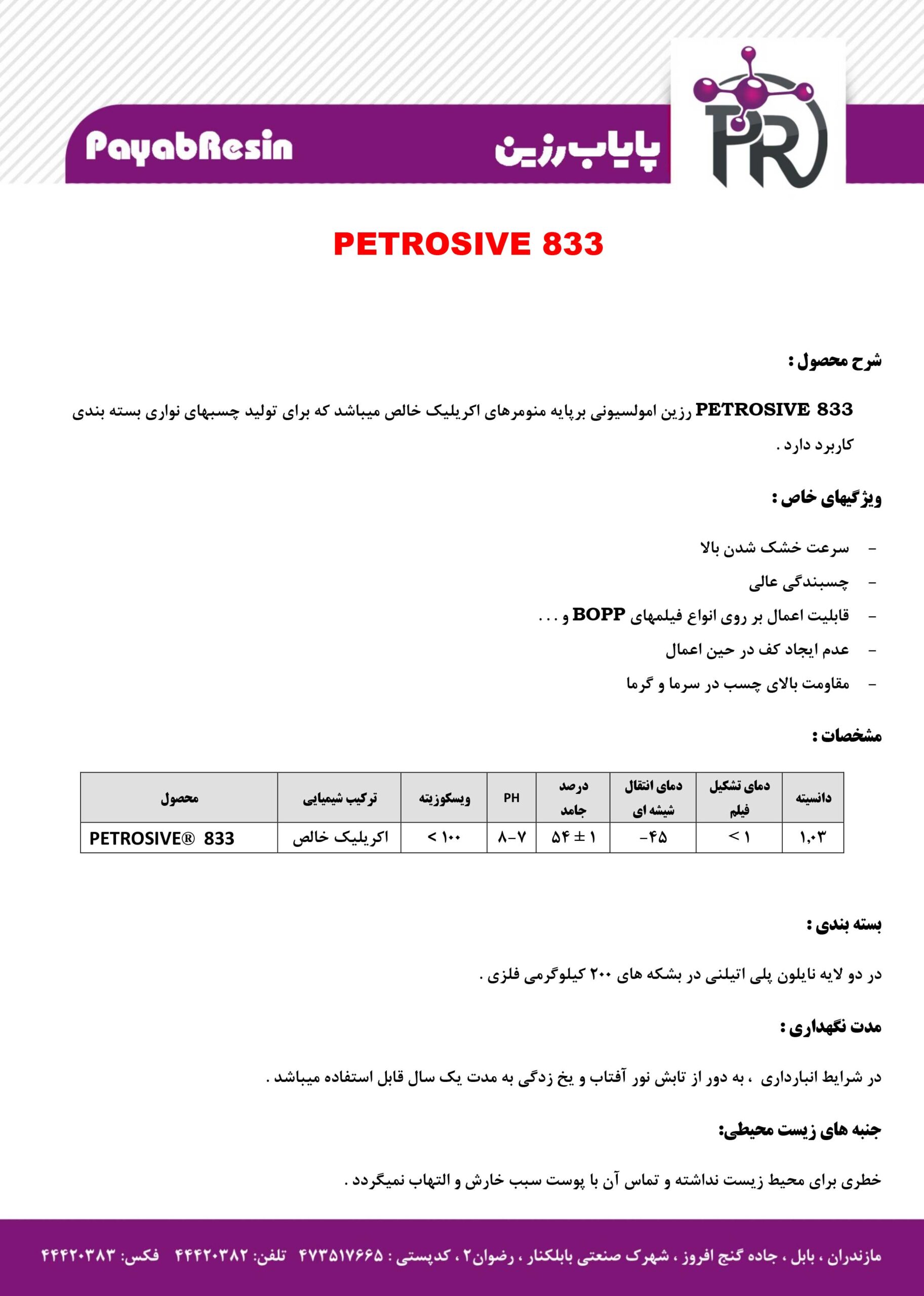 | 1.03 | فیلم شفاف ، چسبندگی خوب | 1 > | 45- | 54 | 7-8 | <100 | اکریلیک خالص | PETROSIVE® 833 |
