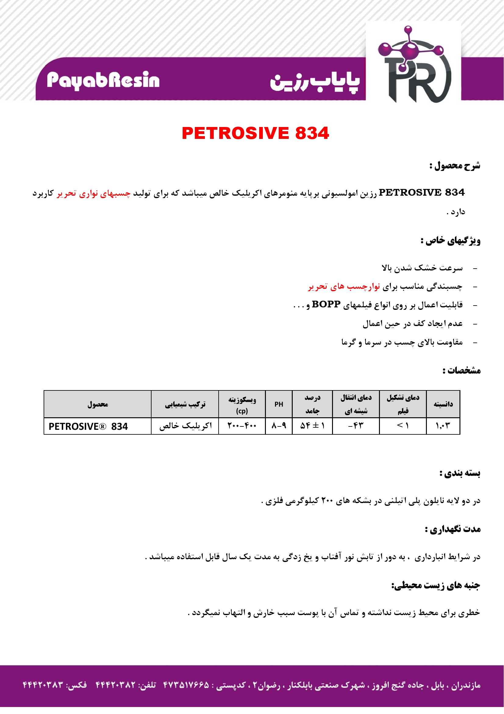 | 1.03 | 1 > | 40- | 54 | 8-9 | 200-400 | اکریلیک خالص | PETROSIVE® 834 |