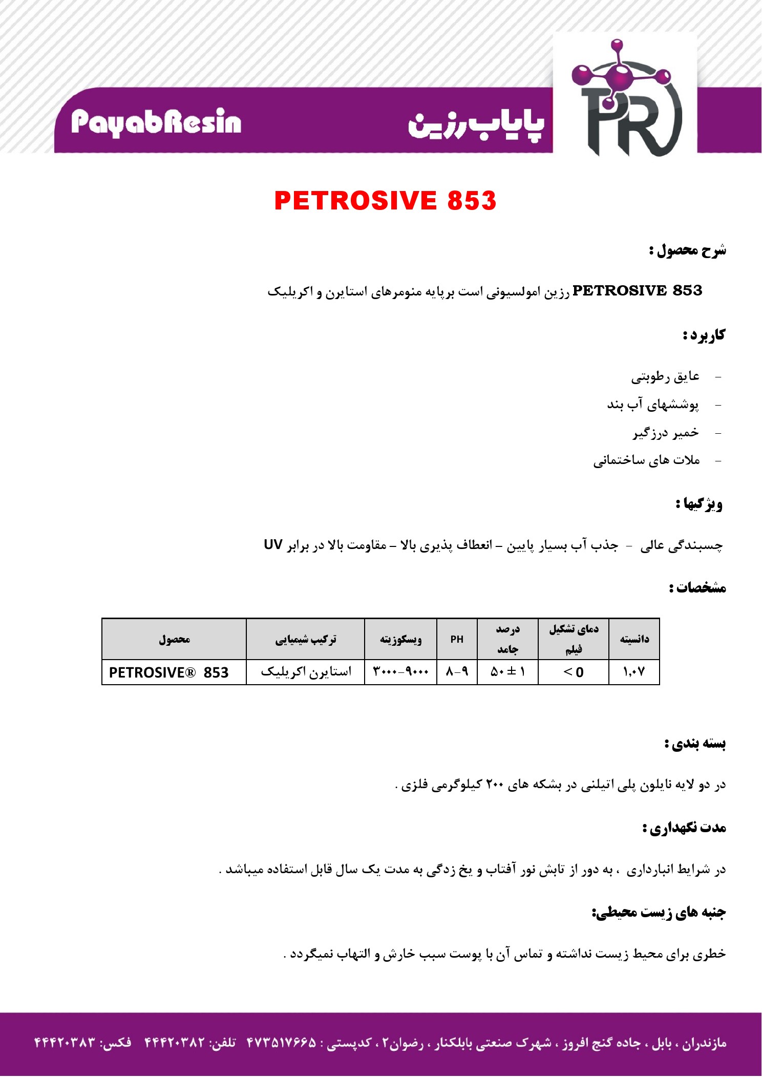 PETROSIVE 853 رزین امولسیونی است برپایه منومرهای استایرن و اکریلیک